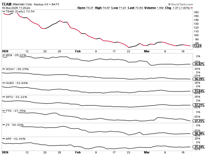 Meanwhile, some of the weakest performers were investor darlings just a few years ago: Atlassian (TEAM), MongoDB (MDB), Workday (WDAY), HubSpot (HUBS), Intuit (INTU), The Trade Desk (TTD), Zscaler (ZS), AppLovin (APP). Every one is a software play.