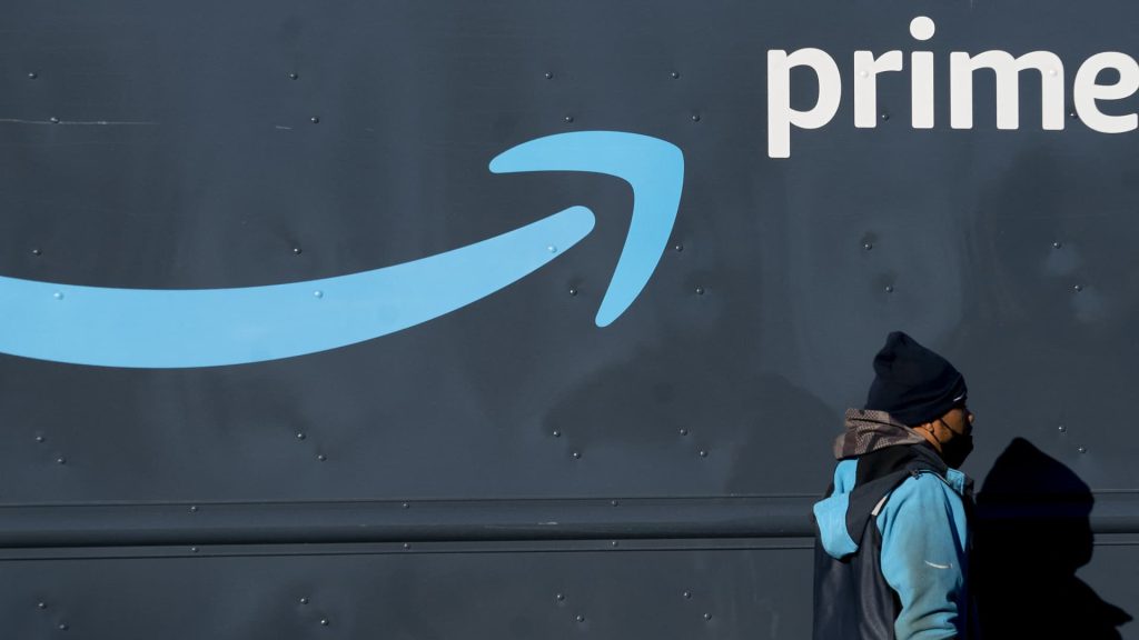 An Amazon worker walks past his Amazon Prime delivery truck in Washington, DC, on February 19, 2022.