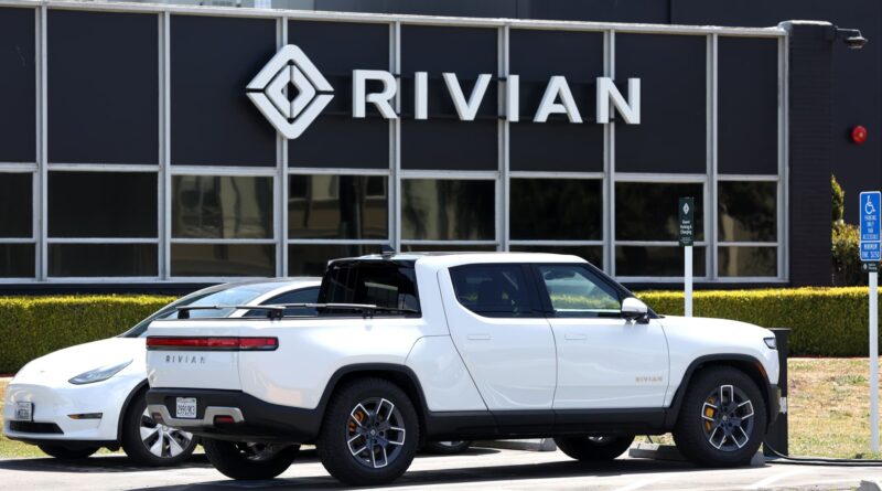 Read MoreRivian electric pickup trucks sit in a parking lot at a Rivian service center on May 09, 2022 in South