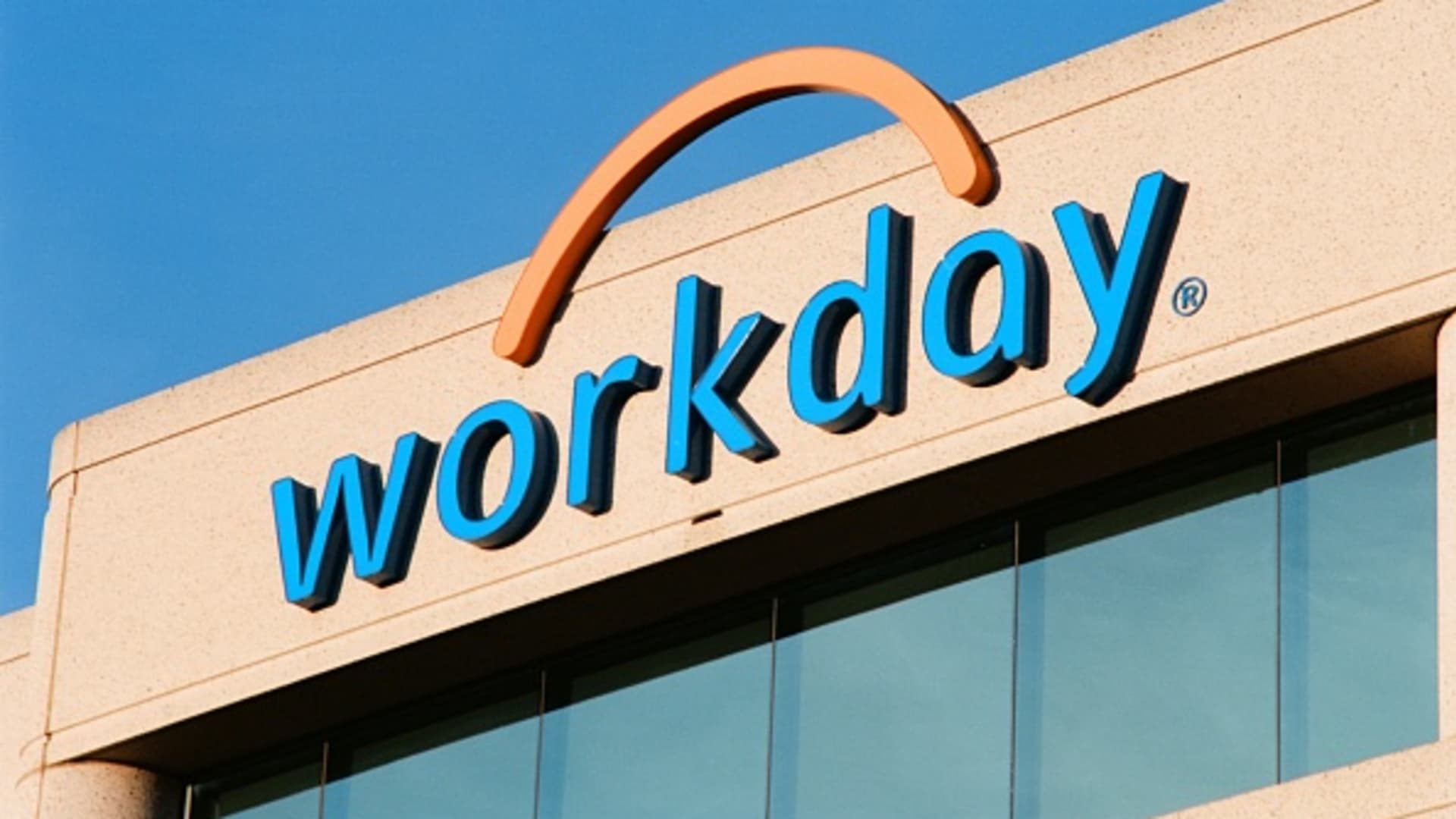 A close-up of the Workday logo on its headquarters in Pleasanton, California, on March 26, 2018.